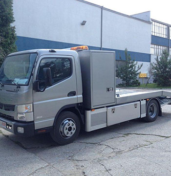Festplateau zur Transport von schweren Bau- und Landwirtschaftsmaschinen, speziellen Gabelstapler. Ideal auch für Abschleppdienst und Spezialtransporten. Plateau ist das am Ende mit einer hydraulisch gesteuerten Rampe ausgestattet ist. Die Plateauoberfläche ist aus Riffelblech gemacht, von unten mit Gerippe zur Konstruktionverstärkung. Ideal zum Transport von Bau- und Landwirtschaftsmaschinen sowie für Abschleppdienst. Sehr guter Auffahrwinkel, niedriger Profil von Seitenwänden und Schäkel ermöglichen sicheres Verladen und Transport von Maschinen.